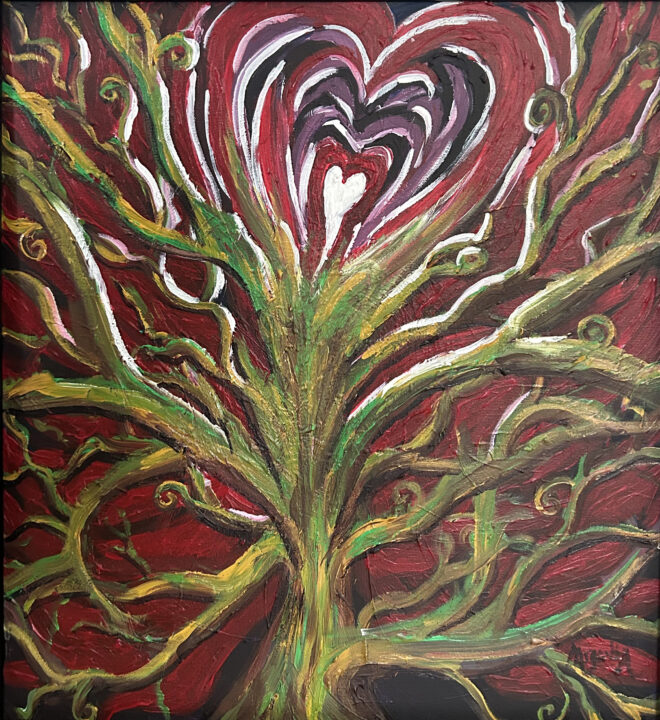 Of her artwork, Peg says: “Bright, lively acrylic paintings emerge through a processing of dreams, emotions, and imagination, and encounters with movement, nature, or the numinous. Using bold colors, flowing movement, and playfulness, feelings and experiences are processed. I heal, grow, and create closure as I encounter peace, joy, and contentment in my creative process. My pieces intentionally reveal something about me and occasionally unveil the unexpected.”